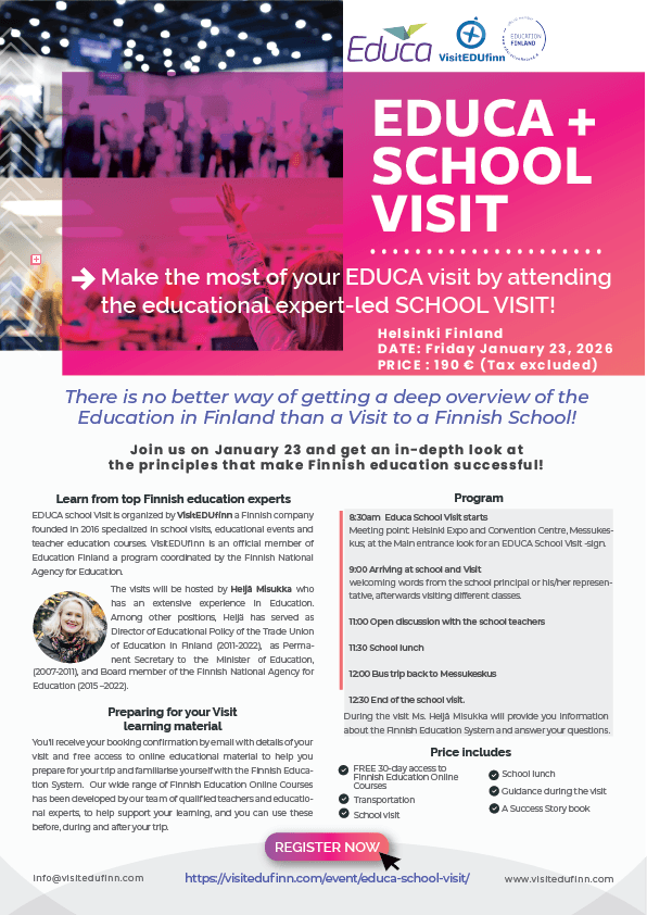 8:00 The visit starts in front of the Messukeskus; look for an Educa School Visit -sign at the Main entrance. During the trip, you will receive basic information about the Finnish educational system.